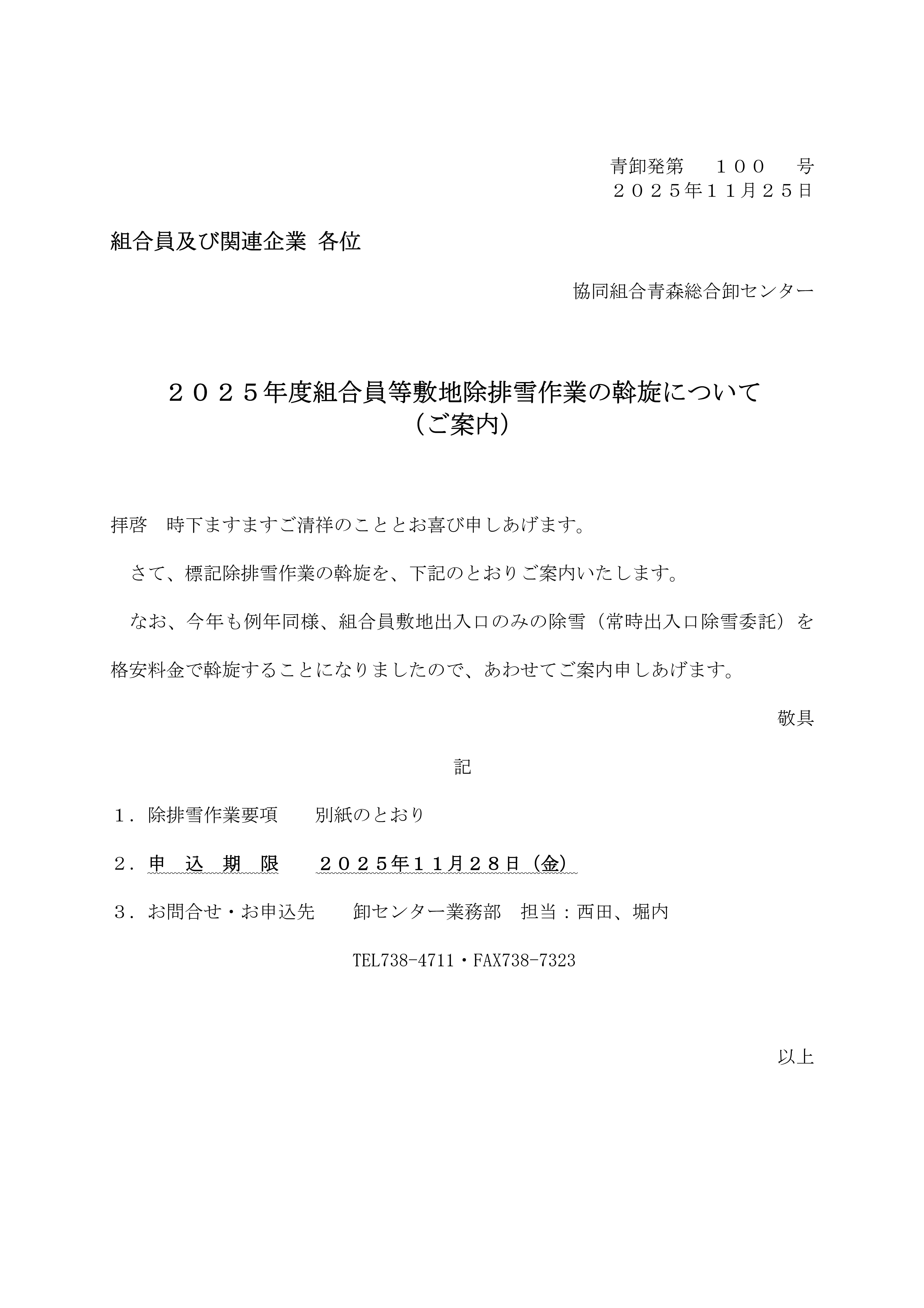 2025年度組合員等敷地内除排雪作業の斡旋について