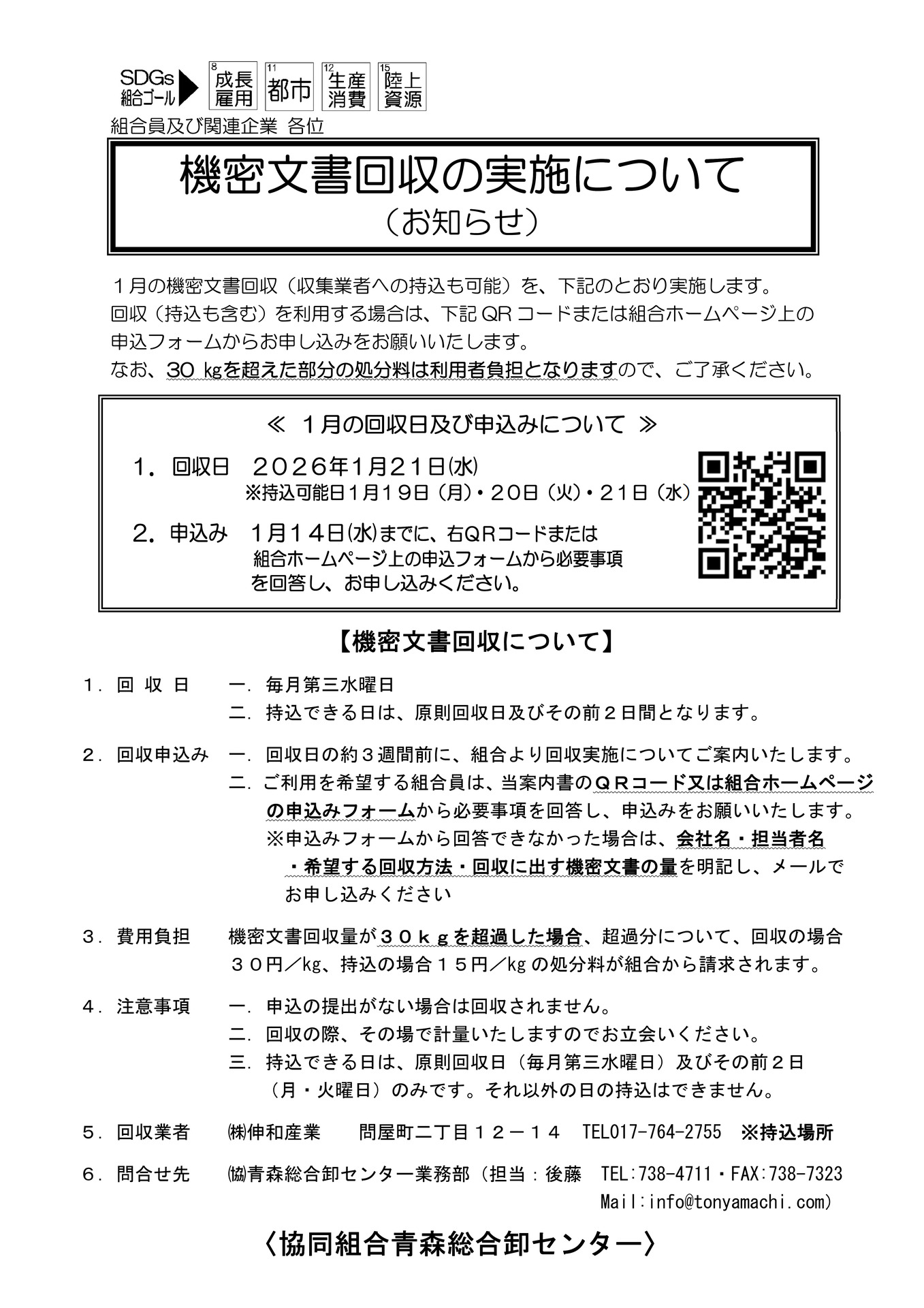 機密文書回収 申込フォーム(回答期限:2026年1月14日)